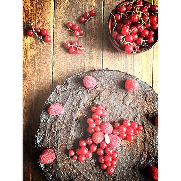 Ho lasciato in frigo a solidificare e poi ho cosparso la superficie con della polvere di carrube raw e dei lamponi del mio terrazzo, ma ci stanno bene anche albicocche, pesche, fragole..